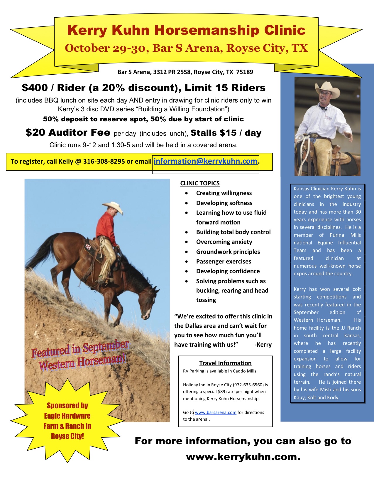 Lodging is available at Holiday Inn Express in Royse City (972-635-6560). Mention that you are attending the Kerry Kuhn Horsemanship clinic to get their special $89 rate. RV hookups are available at the KOA in Caddo Mills just off of FM-36, which is about 12 miles north of the arena.