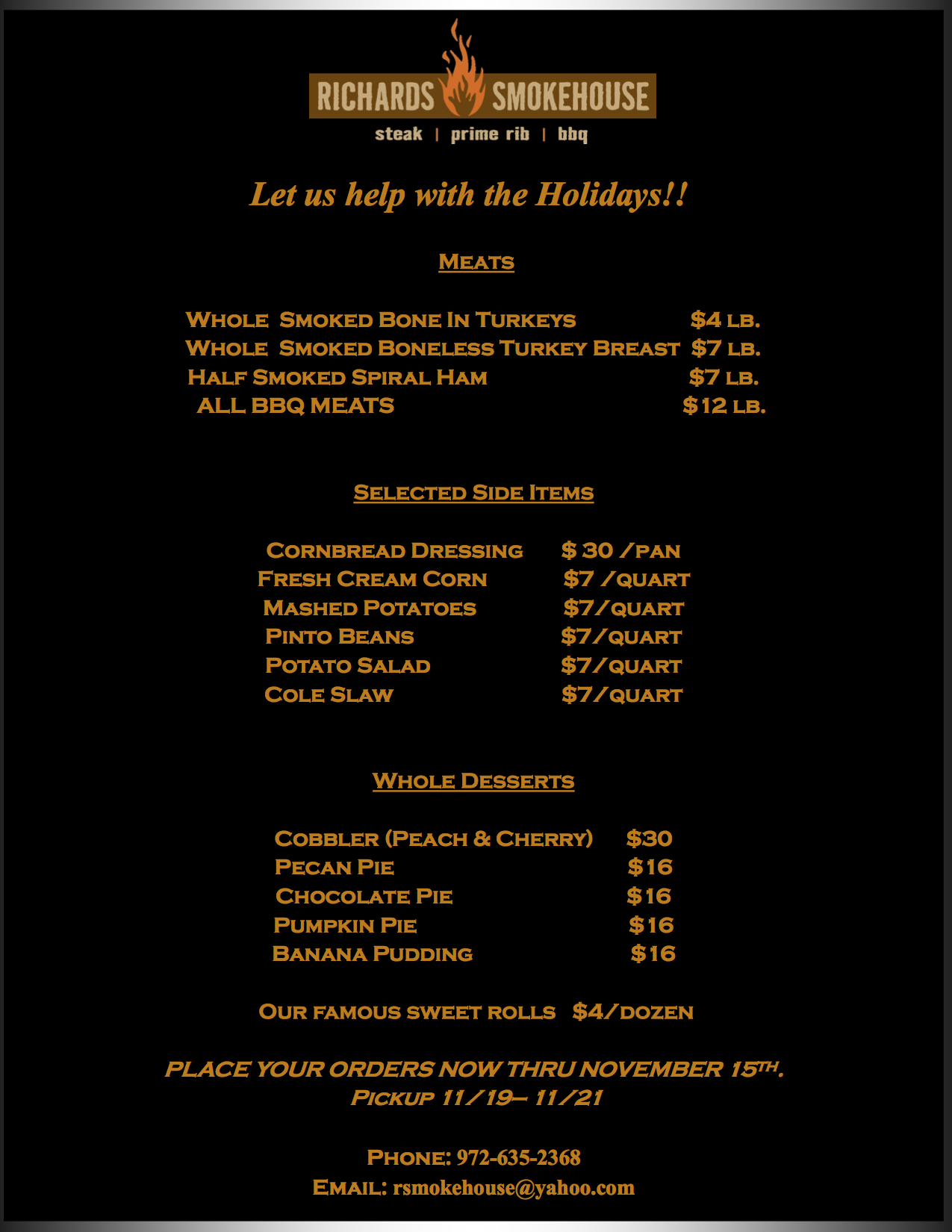 Questions? Call (972-635-2368) or email (rsmokehouse@yahoo.com) Richard’s Smokehouse. To view the holiday menu click […]