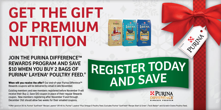 Offer good on 50 lb purchase of Purina Sunfresh Recipe Layena or 40 lb Purina Layena Plus Omega-3 Poultry Food. Excludes Purina Sunfresh Start & Grow recipe, Flock Raiser and Scratch Grains Poultry Feed.